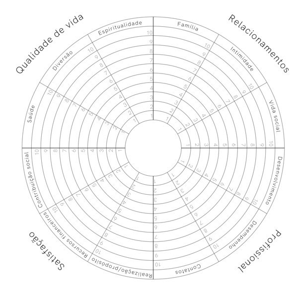 Uma ferramenta que pode te ajudar a iniciar, se você começar olhando para onde você está agora é a roda da vida, que deixo aqui uma ilustração simples da internet mesmo: